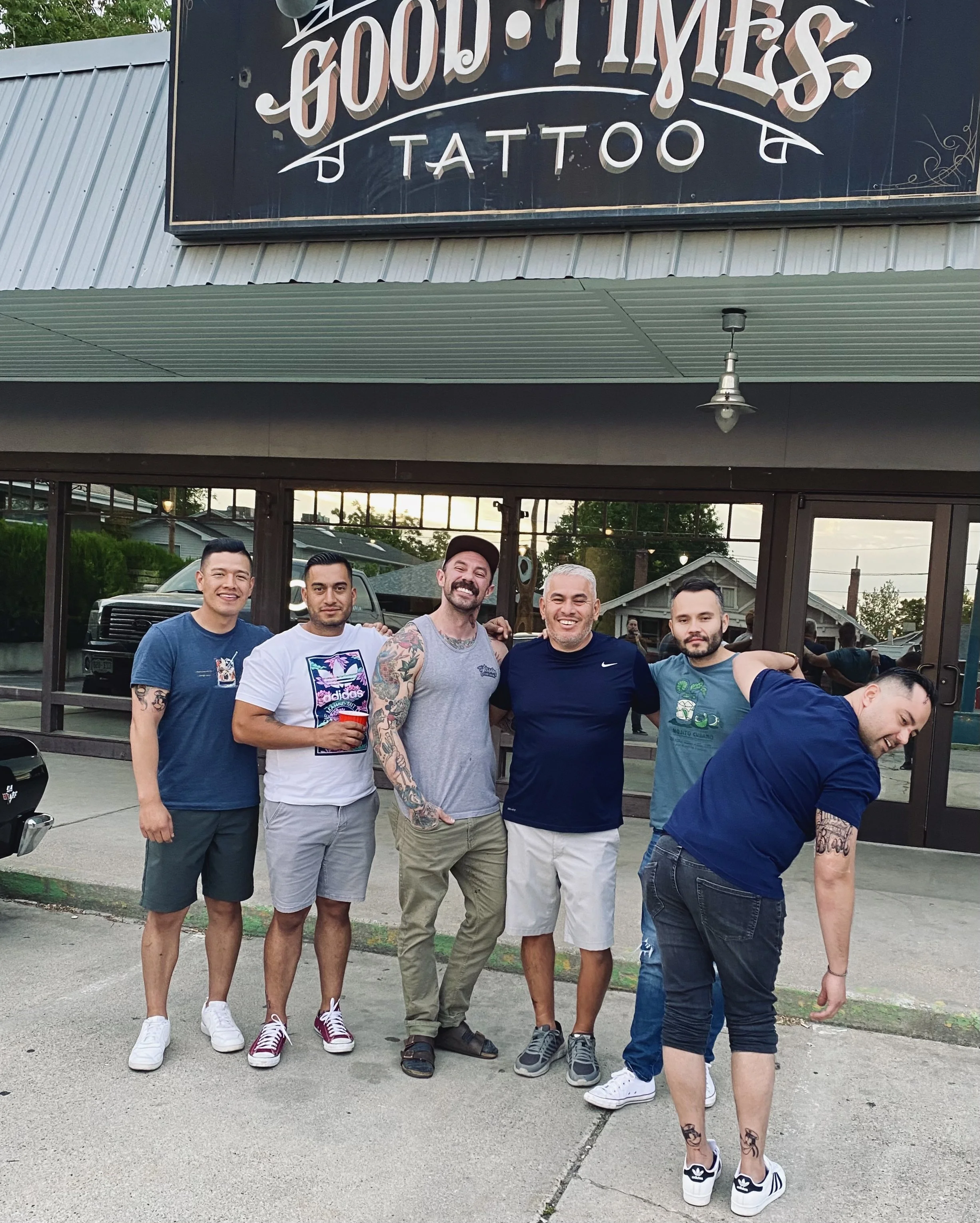There’s another photo. This one’s in front of Good Times, the shop I spent years in. A group of Marines. Laughing. Celebrating. That day, we all got matching Mickey Mouse tattoos. All wearing a Marine Corps cover.